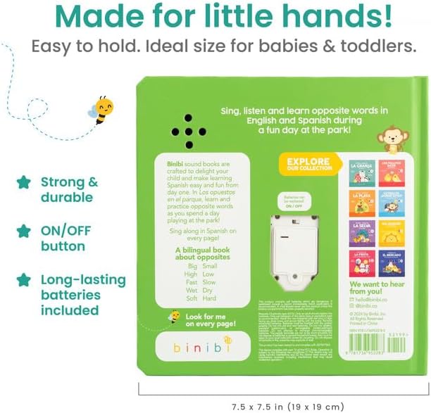 - ๐๐๐ฟ๐ฎ๐ฏ๐น๐ฒ & ๐ ๐ฎ๐ฑ๐ฒ ๐๐ผ๐ฟ ๐๐ถ๐๐๐น๐ฒ ๐๐ฎ๐ป๐ฑ๐. Binibi bilingual English-Spanish books for babies & toddlers 1-3 are durable and feature hard covers, thick pages and rounded corners - they are made for little hands and are easy to clean! All Spanish musical sound books feature an on/off button for extended battery life, and easily replaceable batteries. 3 AG10 batteries in every book.