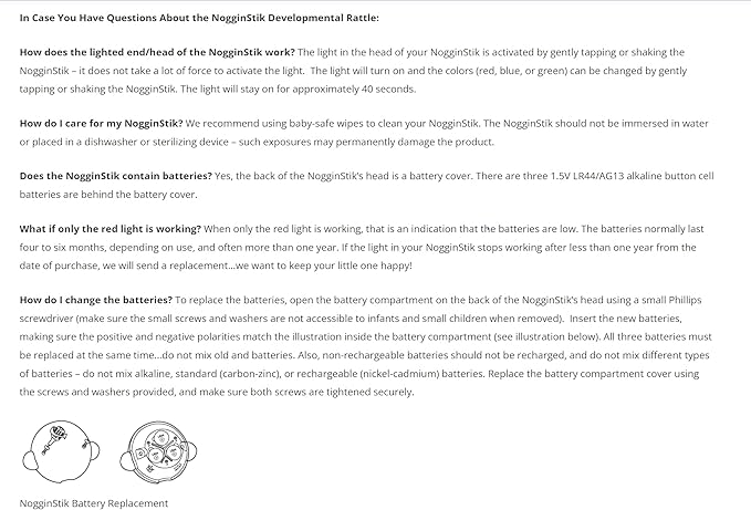 - BABY REGISTRY “MUST HAVE” - The award-winning NogginStik Developmental Light-up Rattle was designed by early childhood experts to help parents, caregivers and early intervention therapists begin encouraging critical early milestones in infants.