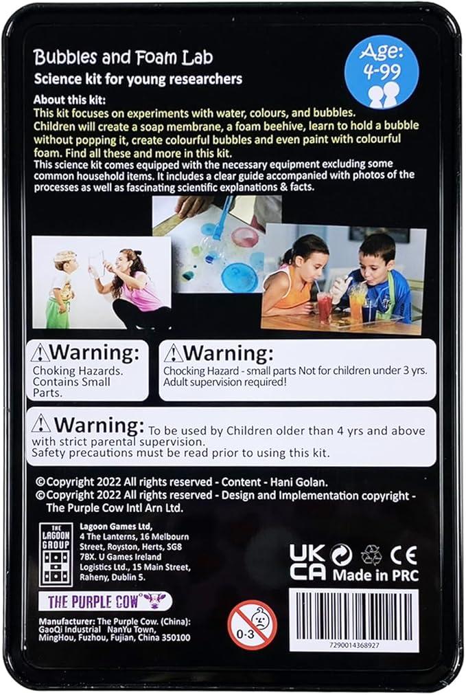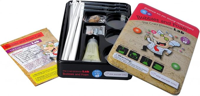 - EDUCATIONAL GAMES: Are fun with water, colors, and bubbles. Create a soap membrane, foam beehive, hold a bubble without popping it, make colorful bubbles and even paint with colorful foam, KIT CONTENTS: All the necessary supplies excluding some common household items, a detailed guide, 15 color tablets, 3 pipettes, 3 Petri plates, 5 straws, jute and liquid soap all in a tin box,The Purple Cow