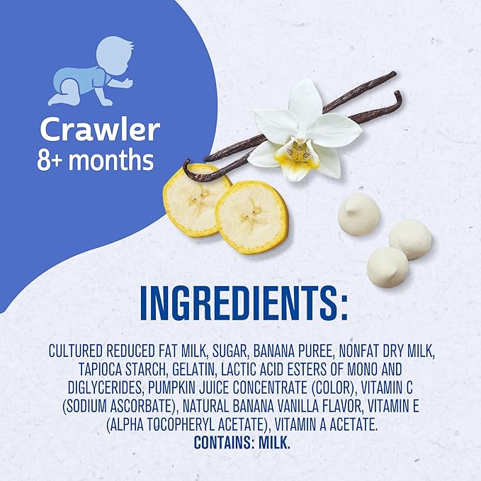 - STAGE 3: These banana vanilla yogurt melts are stage 3 baby food snacks, made for children 8 months and older. Your little one may be ready for Gerber baby melts if they crawl without their tummy on the floor, start using their fingers to eat, or start using their jaw to mash food