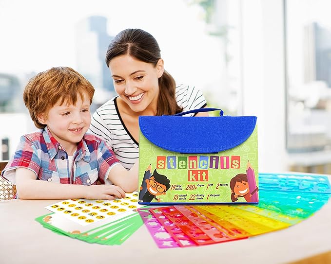 - Complete Drawing Stencils Kit for Kids: Surprise your toddler and kids with a big stencil kit for their art projects! This 55-piece set is complete with papers, colored pencils, sticker sheet, and more!