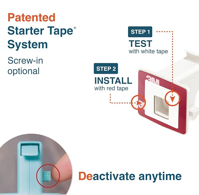 - EASY INSTALLATION: No tools, no drill nor templates needed. Innovative patented Starter-Tape system allows precise installation within a minute. Step 1: test with white adhesive; Step 2: install with red 3M adhesive.
