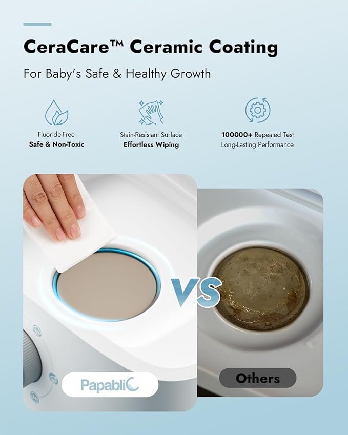 - ๐ญ๐ฌ๐ฌ% ๐ป๐ผ๐ป-๐๐ผ๐ ๐ถ๐ฐ ๐ฐ๐ผ๐ฎ๐๐ถ๐ป๐ด: The first brand to implement ceramic-coated plates in sterilizers. Our pioneer CeraCare ceramic coating is 100% non-toxic, also makes descaling limesacles and mineral build-up a breeze. One less thing to stress about for your newborn's feeding hygiene.