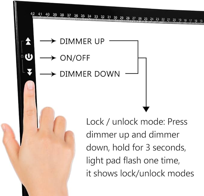 - Innovative Design -- Lock Button Avoid to Touch the button in Careless when Drawing or Diamond painting, Press dimmer up and dimmer down at the same time, hold for 3 seconds, light pad flash one time, it shows lock/unlock modes