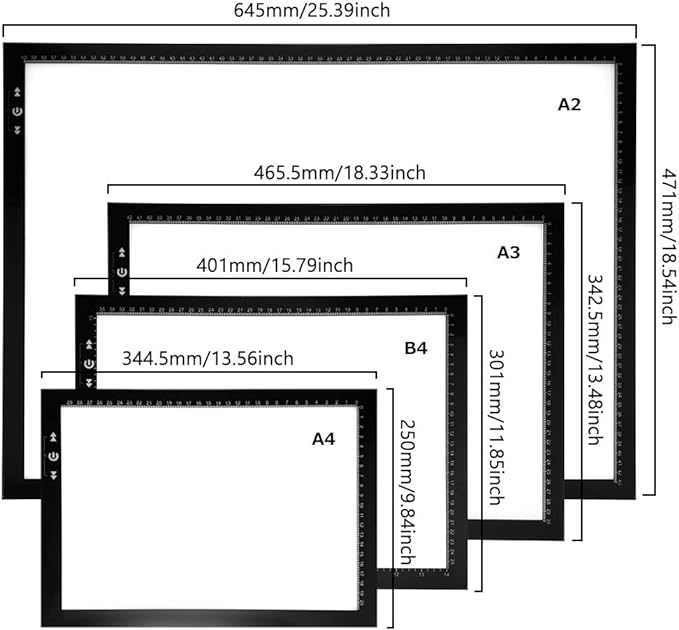 - Easy Carrying -- A3 Size Super Slim Trace Drawing light box with 0.23’’ Aluminum Frame is Sturdy, Light Guide Board make The illumination is perfectly even, super bright, and flicker-free, Overall dimension including Black Frame: 18.33”x 13.48”, Visual area: 16.7” x 11.9”