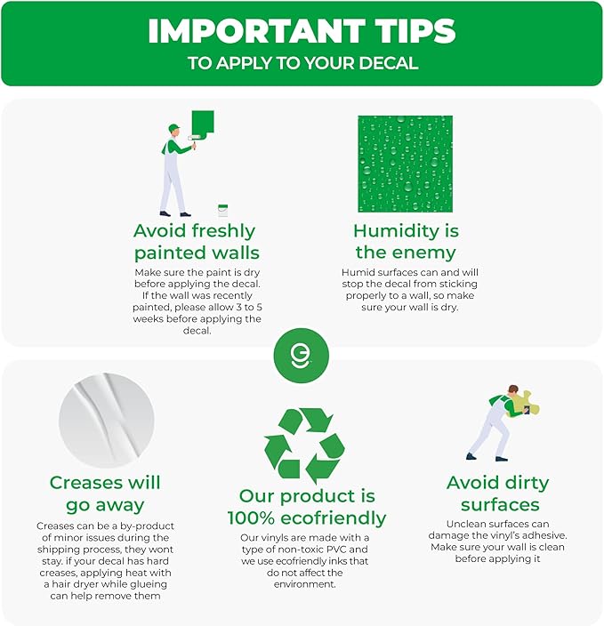 - IDEAL FOR FLAT SURFACES, Our wall decals are best suited for smooth and flat surfaces; We recommend applying them on glass, metal, and smooth walls, avoiding textured surfaces such as stone or brick walls