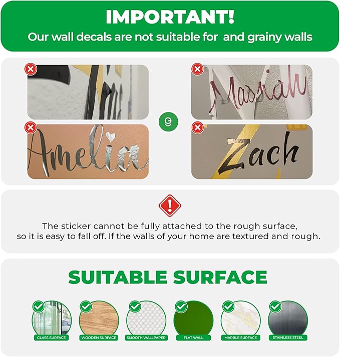 - IDEAL FOR FLAT SURFACES, Our wall decals are best suited for smooth and flat surfaces; We recommend applying them on glass, metal, and smooth walls, avoiding textured surfaces such as stone or brick walls