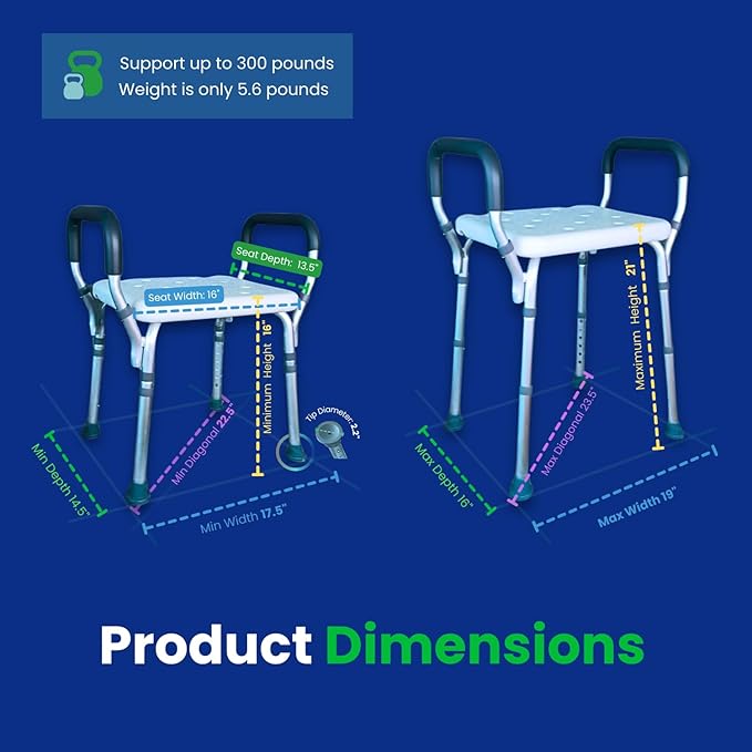 - What size and height adjustments are available? – Adjustable seat height ranges from approx. 15" to 20". Seat dimensions: 16" wide x 13.5" deep. Inside arm width: 19". Chair weighs about 5.6 lbs and is tested up to 300 lbs capacity.