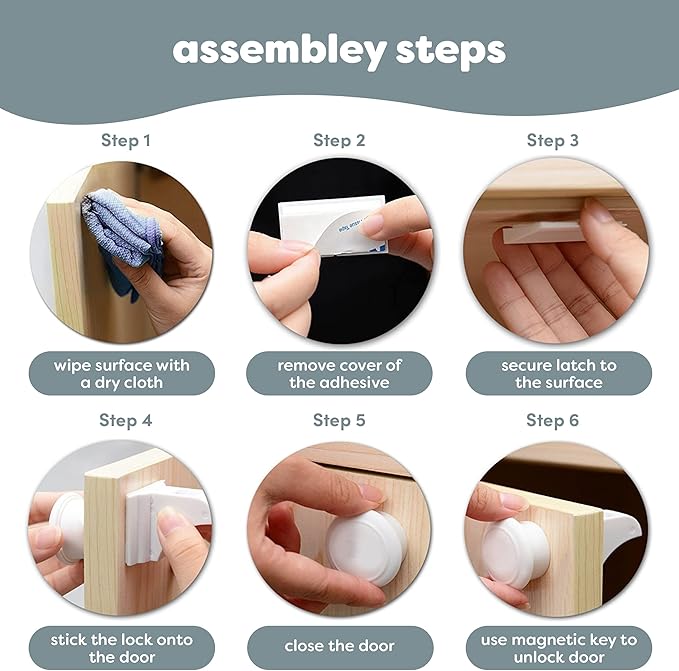 - Installation Tips for Optimal Safety: Before securing with adhesive, check for hidden metal components inside your cabinet doors that may interfere with the function of these magnetic child safety cabinet locks. Move the lock around the door to find the ideal position where it operates smoothly, then install it for lasting performance.