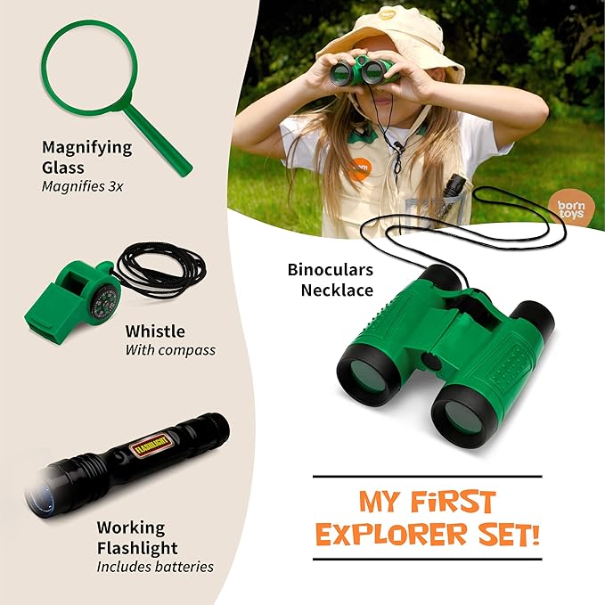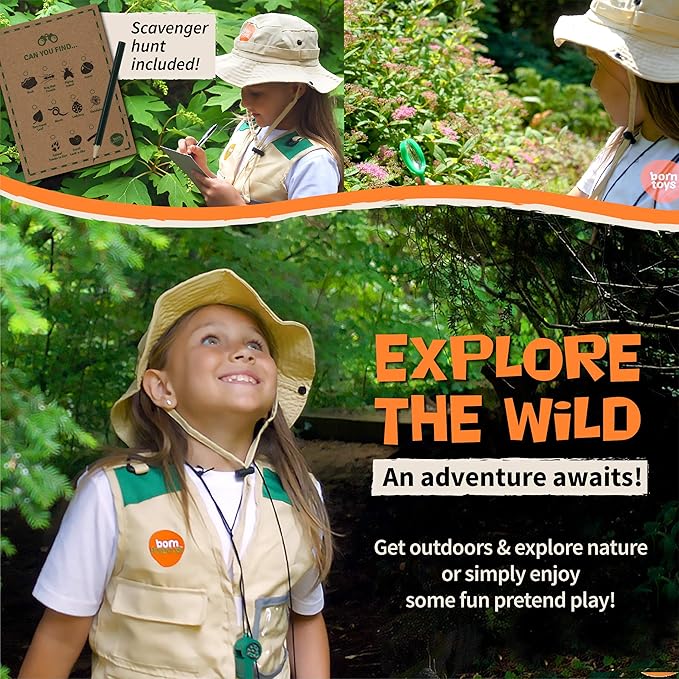 - EXCELLENT QUALITY: Our toy explorer kit for girls & boys exploration set has the highest quality & has the safety standards you deserve. This kids outdoor explorer kit with backyard safari hat, also comes with washable vest, binoculars, scavenger hunt, pencil, magnifying glass, flashlight which includes batteries, whistle w/ compass and storage bag for your bug kit or bug collection kit for kids