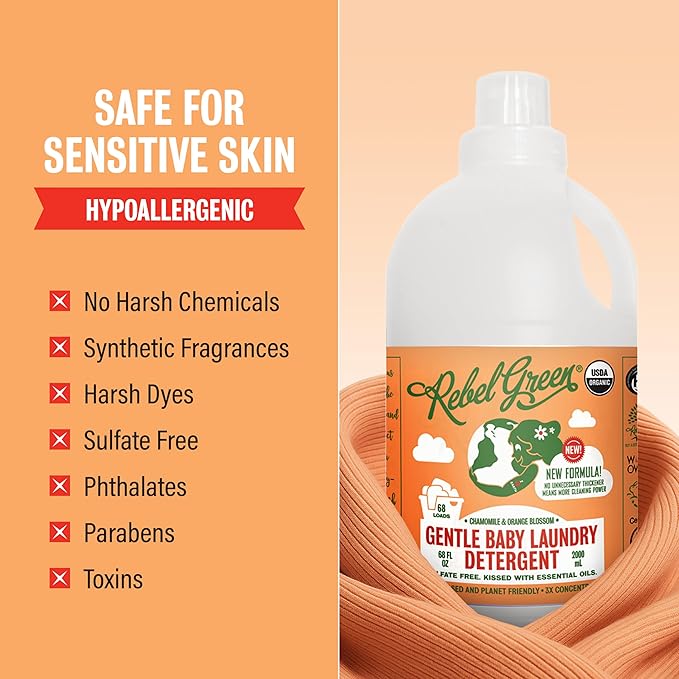 Rebel Green Organic Baby Laundry Detergent - Natural Laundry Soap - Liquid Laundry Detergent - Gentle Laundry Detergent - Chamomile & Orange Blossom Scent - (68 Load Bottles, 2 Pack)