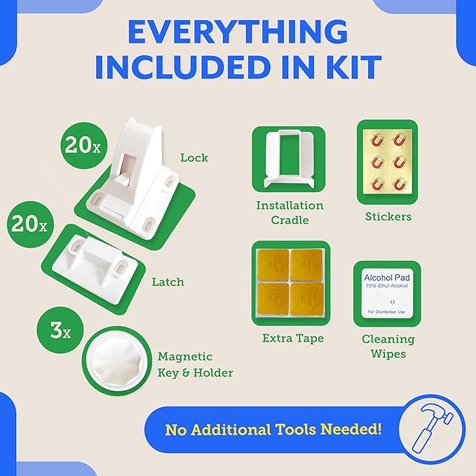- Complete Child Proofing Kit: Take baby safety to the next level with our comprehensive kit, which includes 20 magnetic cabinet locks, 3 keys, 20 latches, an installation cradle, and extra TESA adhesive tapes.