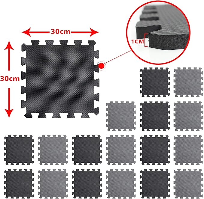 - Cover area: 86CM x 170CM( ±1CM) / approx. 1.46 SQ. M,one sets 18pcs,(300mm x 300mm x 10mm). Package includes 9 BLACK and 9GRAY interlocking foam tiles, making it a perfect workout and training accessory.