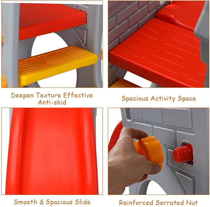 - 【Easy to Assemble & Clean】 The children's castle slide can be assembled quickly, saving you time and effort. It can bring fun for kids right away. And use serrated nuts for reinforcement to prevent loosening. Smooth surface is easy to clean and maintain. You can easily wipe off the stain with a damp rag.