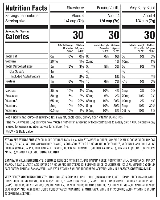 - REAL FRUIT and YOGURT: Nourish your little 1 with Yogurt and Fruit Snacks, made with real fruit and perfectly sized for tiny hands. Includes 8 count each of Strawberry Melts, Banana Vanilla Melts and Very Berry Melts.