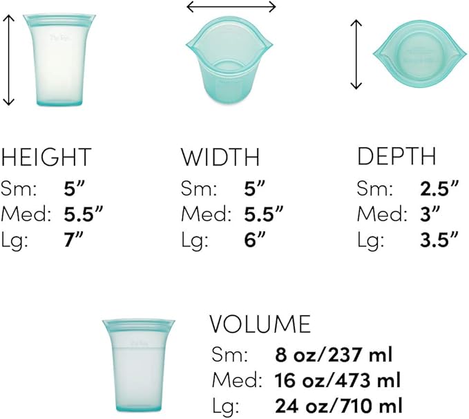 - Set Includes: Small cup 2.5” x 5” x 5” (8oz), Medium cup 3” x 5.5” x 6” (16oz), Large cup 3.5” x 6” x 7” (24oz). A perfect start to replace single-use plastic bags and plastic food storage containers with lids.
