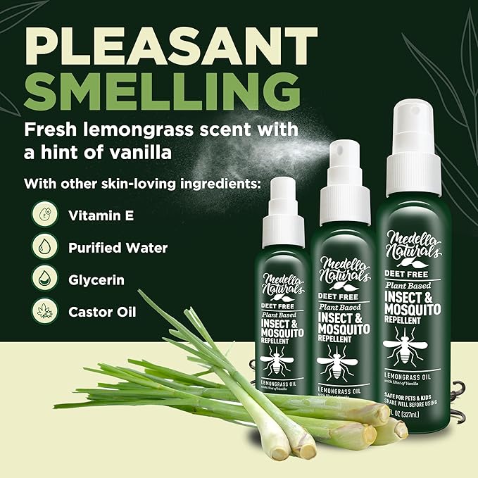 - DEET FREE BUG SPRAY – Unlike DEET bug sprays, Medella protects you from gnats, black flies, no-see-ums, and mosquitoes using lemongrass essential oil – no harmful chemicals. Our insect repellent spray is also non-flammable and grass-safe.