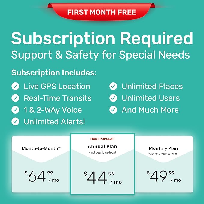 - FREE SERVICE FOR 1st MONTH with easy activation | MONTHLY SUBSCRIPTION REQUIRED: 49.99 per month with a 1-year contract & includes SIM card, Unlimited Live Tracking, Assistive Speakerphone with 60 Voice Mins per month, Intelligent Alerts, Premium Safety Features, Unlimited Live US Customer Care, & more | KIT INCLUDES: AngelSense GPS Device with Speakerphone, Soft Protective Sleeve, 3 Non-Removable Fasteners, Parent Key