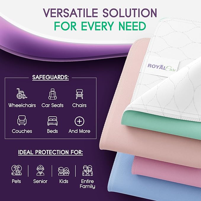 Incontinence Bed Pads - 4 Pack 18” x 24” Reusable Waterproof Mattress Protectors - Highly Absorbent, Machine Washable - for Children, Pets and Seniors - Assorted Colors - Royal Care