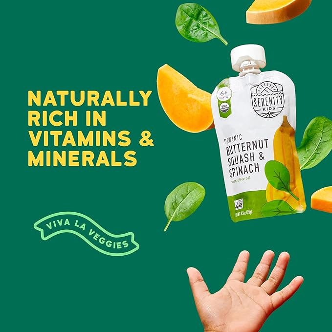 - Organic Flavor Boost: Dive into the world of Serenity Kids with our organic butternut squash and spinach veggie pouches. These baby purees are perfect for little foodies wanting to experience rich fall baby puree flavors without any added sugar
