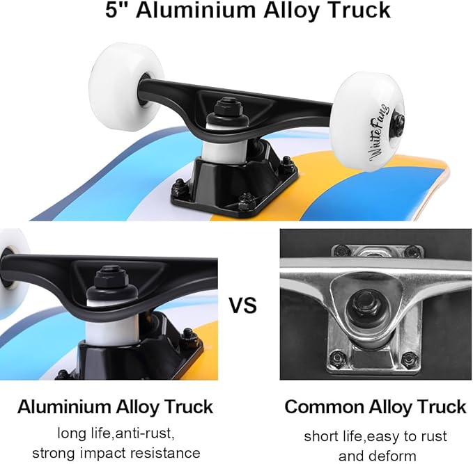 - 🛹 Take You a Better Experience: High speed 95A PU wheels work with ABEC9 bearings and 95A High rebound PU bushing. Give you better balance control and shock absorption effect, bring you a better skateboard experience.