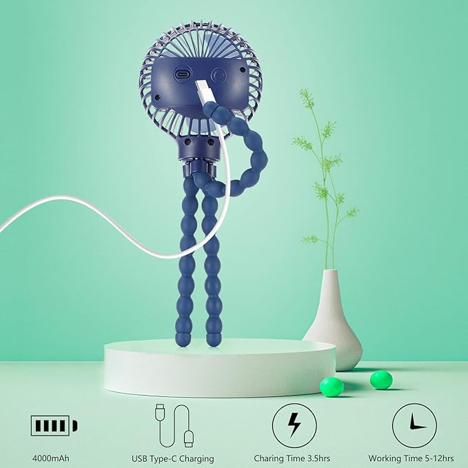 - 【USB or Rechargeable Battery Operated】This portable stroller fan is powered by USB or Battery using Type-C interface. It can be charged by computer, laptop, power bank, car charger etc. The build-in rechargeable battery has real 4000mAh, not fake capacity. 3.5hours for full recharge, 5~12 hours working time depends on speed.