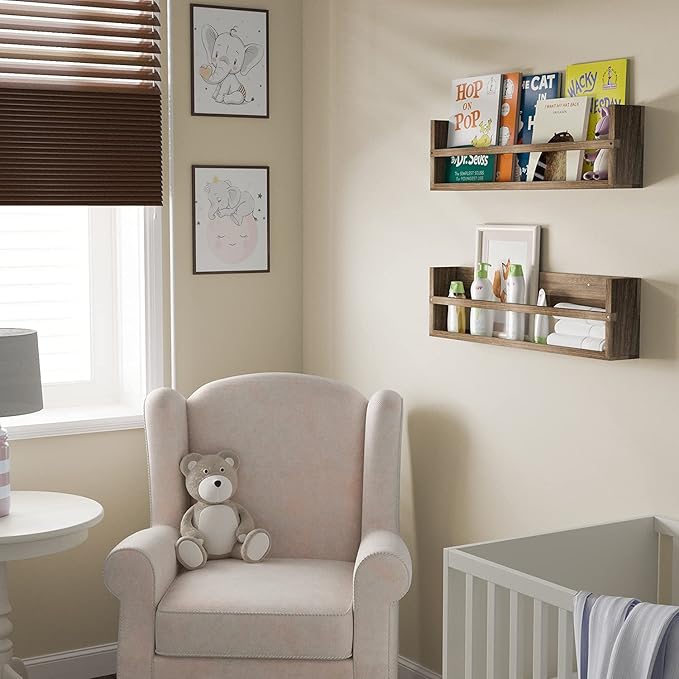 - Multiuse Shelf: Thanks to these storage shelves' wooden and simple design, you can use them not only in your kids room or nursery but also in different places. Mount them on your bathroom wall as makeup organizer or your kitchen to store spice jars and display recipe books.