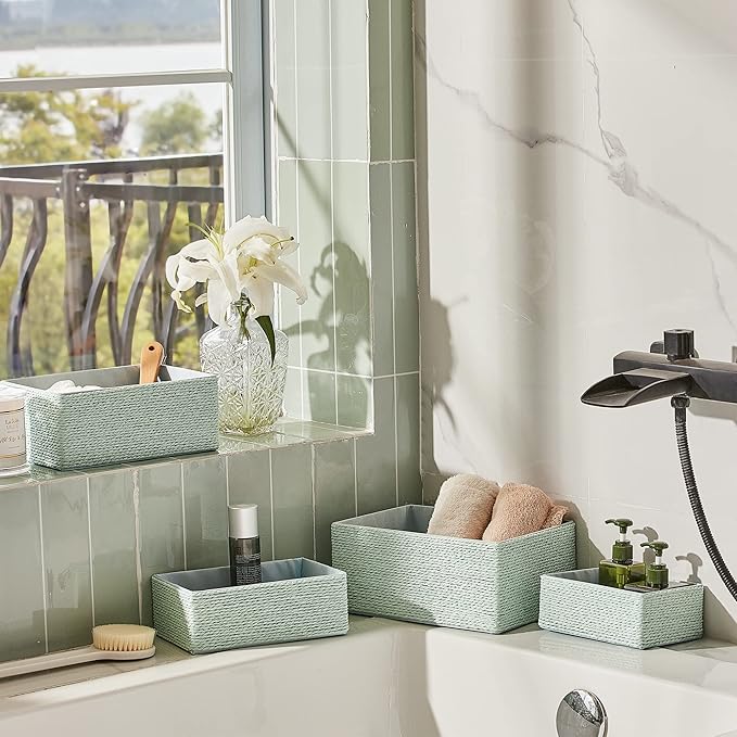 LA JOLIE MUSE Storage Baskets Set 4 - Stackable Woven Basket Paper Rope Bin, Storage Boxes for Makeup Closet Bathroom Bedroom (Light Green)