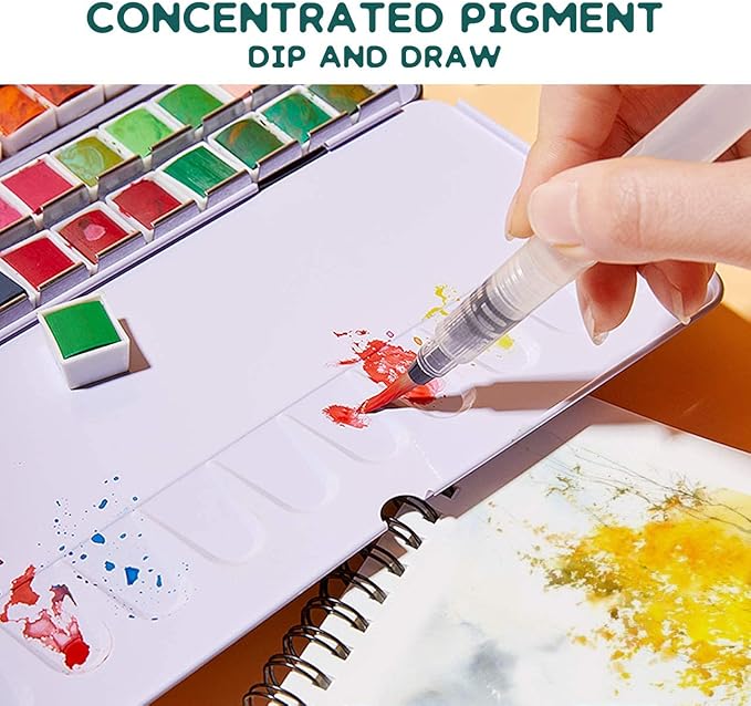 - 【Perfect Gift Choice】 This watercolor set is packaged with a metal box and includes a water-filled brush pen. A built in finger ring design makes you more convenient to carry this tin box. The half cover of this box can be used as palette. Great gift for students, watercolor lovers, professional watercolor painters, kids.Ideal for coloring books, business cards, art diaries, sketching and creating your own artwork on watercolor pad