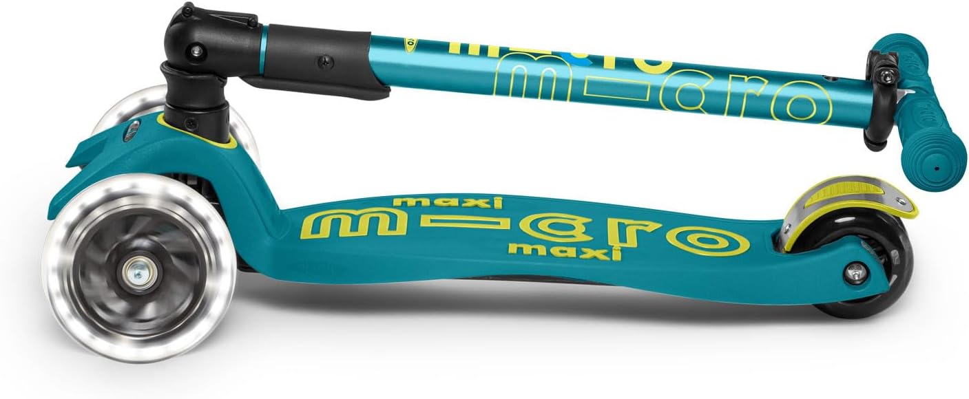 - Micro's newly upgraded Maxi Deluxe Foldable LED features motion-activated light-up front wheels and a foldable T-bar for easy carrying & travel. Created with a lean-to-steer design, offering a stable ride that supports children as they curve and carve the sidewalk.