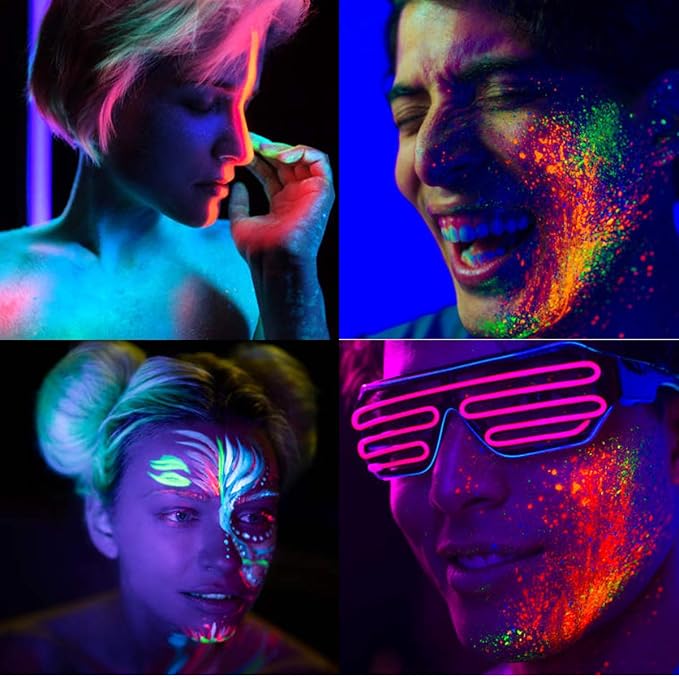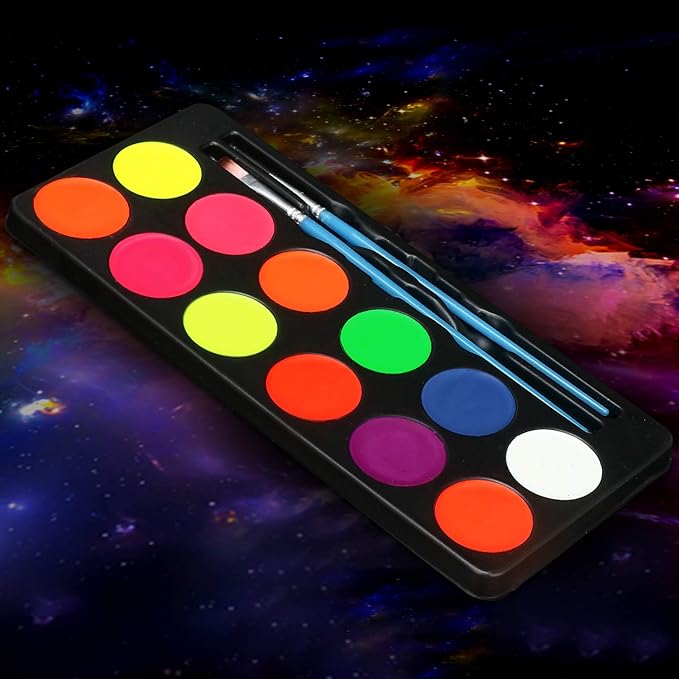 - 【12 Colors UV Set】Our face painting kit includes 12 neon glow colors UV face paint, 5 sets of painting stencils, 1 large brush for greater coverage and a vibrant finish, 1 thin brush for ultra-fine lines and sharpening the edge of. At night or under a black light, these paints will shine a stunning neon glow, making you the center of attention for any occasion! .