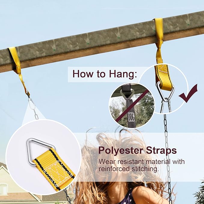 - 【No Need to Buy Tree Swing Hanging Straps】Unlike other swings for trees, extra two swing hanging straps (23.6" long each) are included in our sling swing seat so that you needn't to prepare other installation parts. It is easy to hang on the trees or other places without any tools and you can adjust the length to meet your needs by the hanging straps, which solves your concerns about the lack of length. What's most, polyester material of hanging straps has good performance of bearing force.