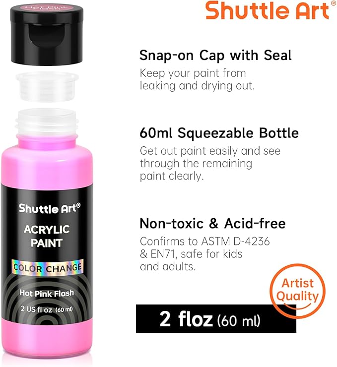- 16 COLORS CHAMELEON PAINTS : Shuttle Art color change acrylic paint set contains 16 colors color-shifting paint in bottles, and each contains 60 m/2 oz premium quality iridescent paint, perfect for painting, crafting, art innovation and more