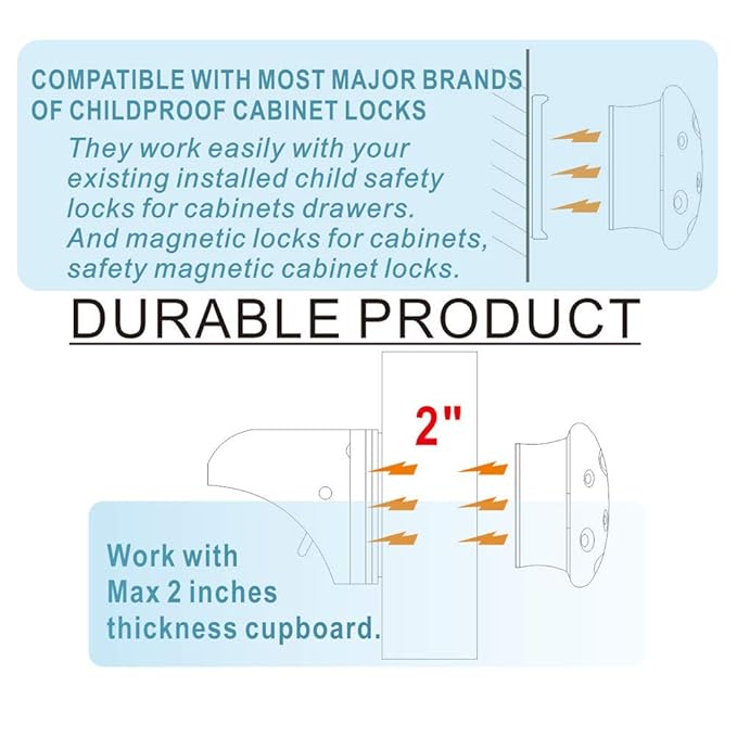 - DURABLE PRODUCT - Work with Max 2 inches thickness cupboard. Never Drop apart. Touch the magnet to the surface of the cabinet to disengage the lock. Keep extras around the house where children can't reach them so you don't have to worry about not being able to open your cabinets and drawers. Babies must have saftey items.