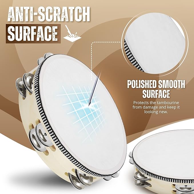 Flexzion Wood Handheld Tambourine for Kids (2 Pack) 8 Inch Double Row 12 Pair Jingles, Hand Held Percussion Drum Moon Musical Instrument with Metal Bell