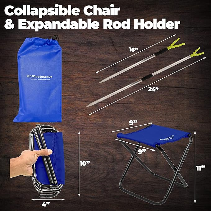 - COLLAPSIBLE CHAIR AND ROD HOLDER - Kids have a place to rest wherever they go. The rod holder keeps the fishing pole off the ground and minimizes the chance of accidental damage.