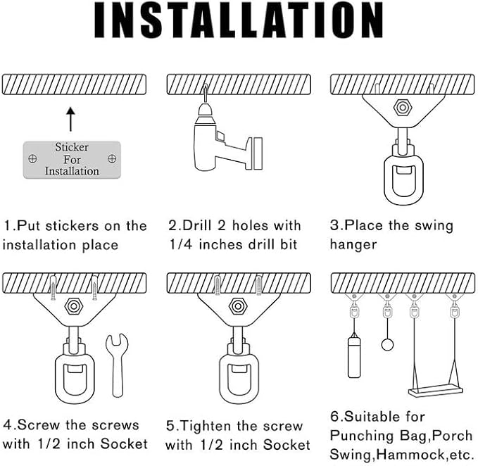 • Widely used in WOOD and CONCRETE : Our swing hardware provides 2 SCREWS for WOOD and 2 EXPANSION BOLT for CONCRETE, Perfect for Ceiling, Punching Bag, Porch Swing, Hammock, Swing Chair, Ring, Yoga Swing, Boxing Equipment, etc.