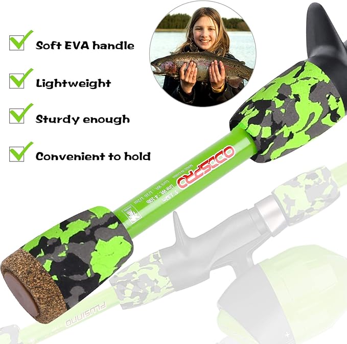 - 【 Starter Fishing Kit For Kids 】Comes with a Soft Casting Plug, with perfect size and weight, kids can cast in the backyard or on the shore to sharpen up their casting skills. An instruction manual is included, so kids beginners can quickly learn how to fish.
