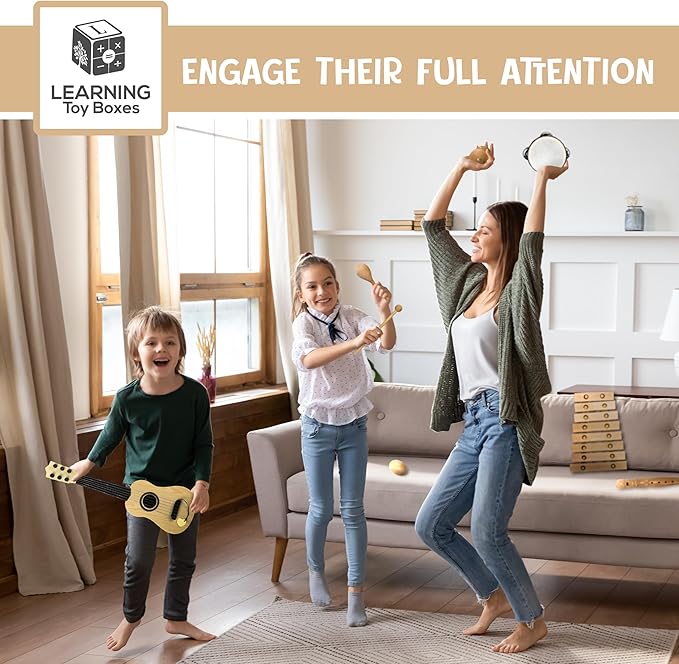 - ★【Educate Next Generation No Matter The Learning Disability】Our premium wooden musical instruments for toddlers 1-3 grades is made for every child and encourage rhythm and music sense in children of different ages. Includes: 1 Xylophone for toddlers 1-3 Set 1 Tambourine 1 Castanets 1 Egg Shaker 1 Recorder 1 Maracas and 1 Untuned Mini toddler guitar.