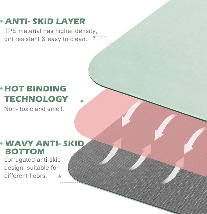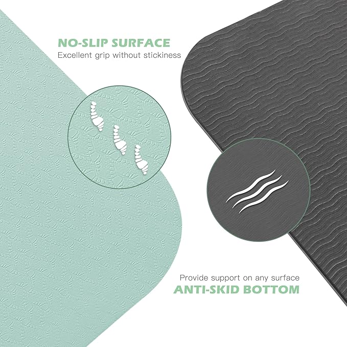 - DOUBLE NON-SLIP DESIGN - This workout mat has double-sided non-slip surfaces. Wavy undersides make excellent traction on the floor. It unrolls pretty flat and stays put. Special textured surface prevents your hands and feet from sliding when you sweat on it.