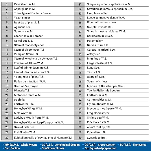 - Set of 60 prepared microscope slides, including plants, insects, and animal tissues, for use in biological education