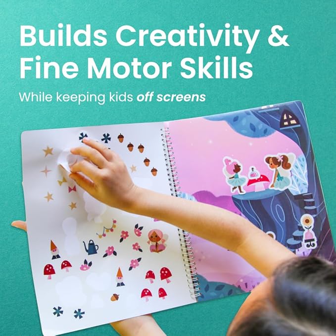 - Learn through play: Kids build fine motor skills, explore spatial awareness, and strengthen hand-eye coordination as they peel and stick stickers onto colorful scenes! Engaging in conversations about the sticker book characters will help imaginations run wild & encourage make-believe and pretend that can foster bonds between you and your child. Go ahead - play on!