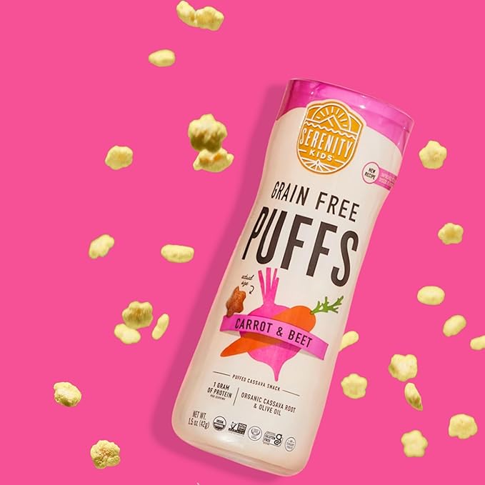 Serenity Kids 6+ Month Grain-Free Baby Veggie Puffs - No Added Sugar - Gluten-, Rice-, Dairy- & Soy-Free - Organic Cassava, Carrot & Beet - Portable Toddler Snacks - 1.5 Oz, 6 Pack