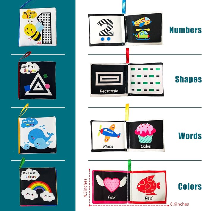 - Pack of 4 themes – numbers, shapes, words, colors, these soft cloth books will help babies to see this word, bring Visual Stimulation, improve memory. It is a great early learning toy.