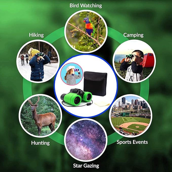 - Best Gift for Kids : Designed for kids binoculars,soft-rubber eyepiece protect the eys, so kids won't hurt their eyes.The compact kids binoculars can be folded to match eye to eye Distance Of Child.Great for bird watching, learning, hunting, theater, boat rides, hiking, traveling, and enjoying the wilderness! Explore the world with your kids!Perfect For The Children's Toy Or Educational Gifts