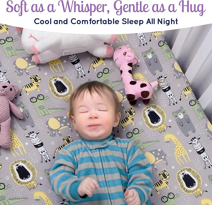 - πFUN & CHARMING DESIGN - Our crib mattress sheets features an adorable Safari Jungle pattern. This charming design brings the calming essence of the sea into your baby boy nursery.