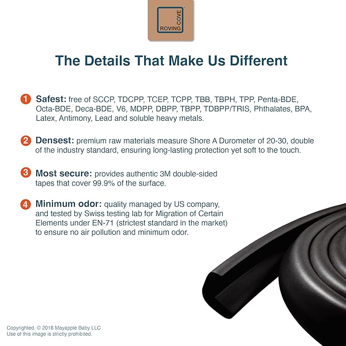 - CLEAN SAFETY: Roving Cove uses safe and pure raw material and was the first brand to make foam safety bumpers without the use of toxic flame-retardant chemicals (SCCPs). Our edge protector cushion contains no BPA, no phthalates, no heavy metals, no latex, no SCCPs. Inherently flame-resistant; passed flammability tests under US regulations.