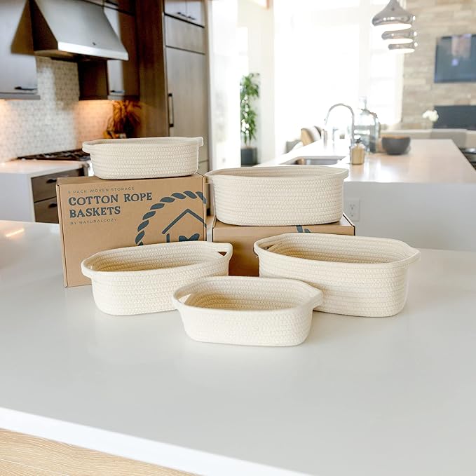 NaturalCozy 5-Piece Rectangle Storage Basket Set- Natural Cotton Rope Woven Baskets for Organizing! Small Basket for Montessori, Baby Nursery, Dog Toy Baskets, Cat Toy Box, Bathroom Organization Bin