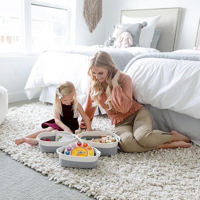 - DOUBLE REINFORCED & SCRATCH-FREE DESIGN: When you’re a full-time mom or dad, you need a storage solution that works just as hard as you do. With reinforced stitching on the handles and base, our woven storage basket set is ready to tackle some heavy-duty actions and will sustain the roughest toddler play. With our soft yet firm handwoven rope basket designs, you’ll never have to worry about scratches or marks being left on your coffee table, shelf, front door table, nightstand or any tabletop.
