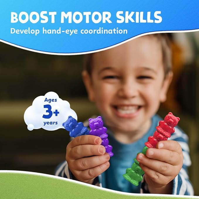 - FINE MOTOR SKILLS TOY: This kids stacking game encourages 3-5 year old to move carefully as they build their stacking blocks. It promotes fine motor development including hand-eye coordination, visual perception, manual dexterity and motor planning, all while being a fun stacking bears game. With 10 different bright colors, these rainbow colored blocks for kids are a fun way to train color recognition.
